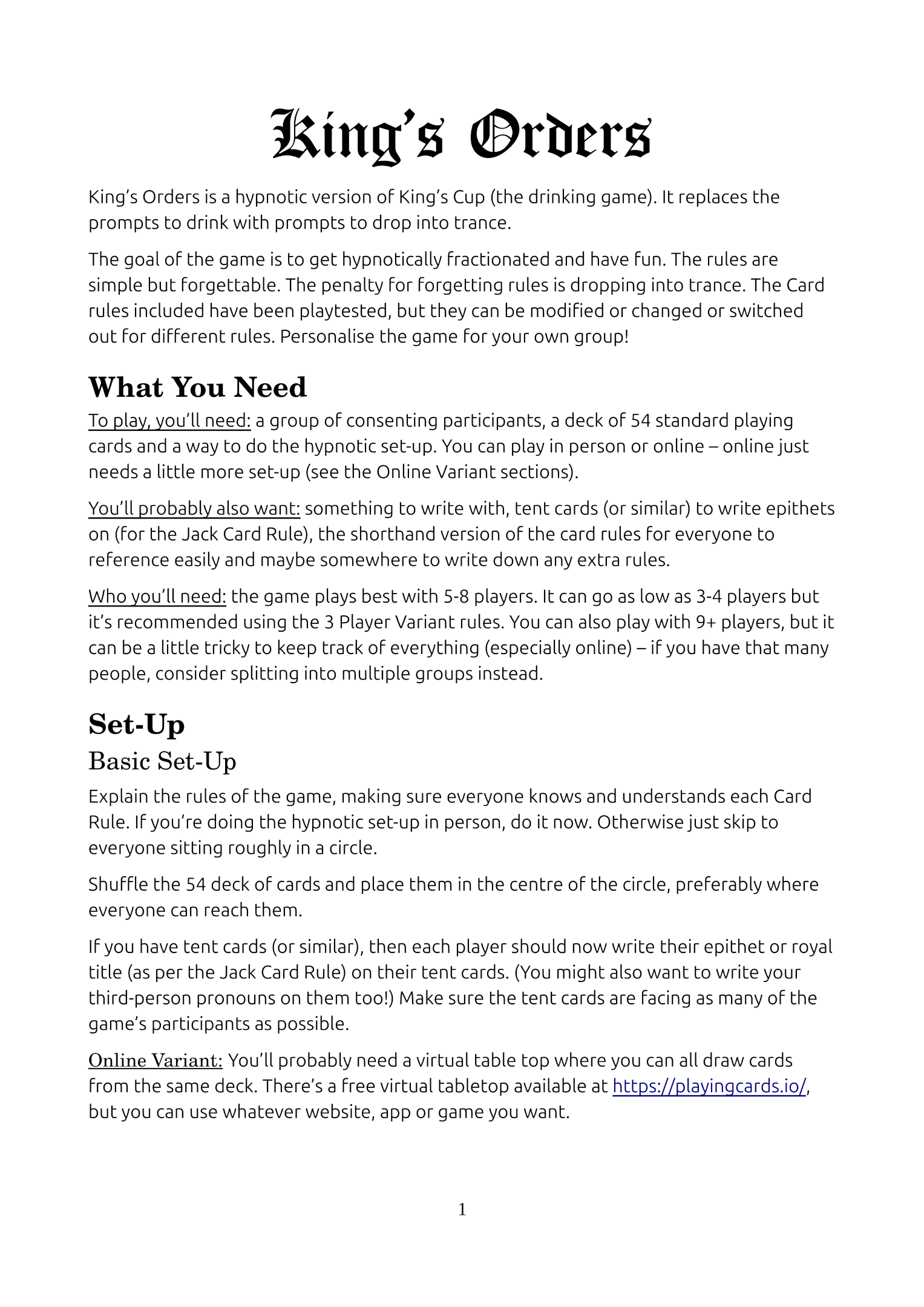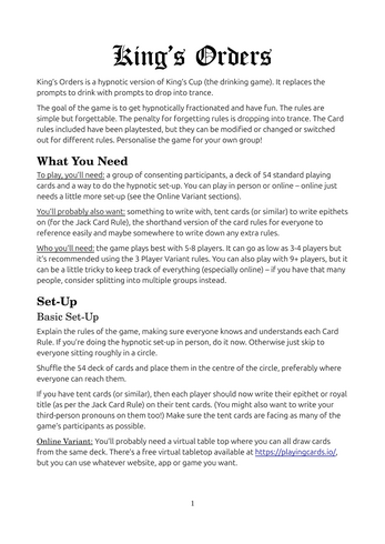 King’s Orders is a hypnotic version of King’s Cup (the drinking game). It replaces the prompts to drink with prompts to drop into trance.
